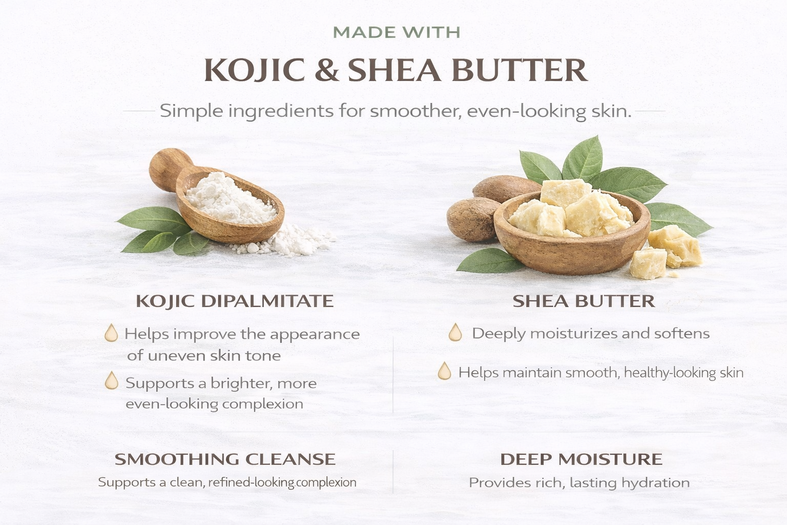 A nourishing bar soap made with shea butter, turmeric, and kojic dipalmitate to gently cleanse while helping improve the appearance of dull, uneven-looking skin. This creamy bar creates a rich lather that cleanses comfortably, leaving skin feeling soft, smooth, and refreshed after each use.